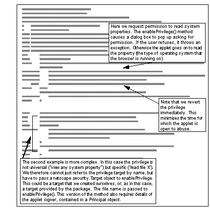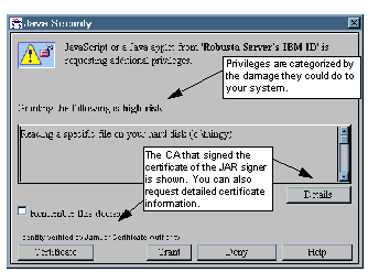 To use the JAR, we must place it on the Web server and reference it in an <APPLET> tag as we did in the javakey/jar example. When we load the page in a Netscape browser, each of the enablePrivilege() method calls causes a dialog box to pop up on the user's screen, as shown in See Applet Requests a Privilege .