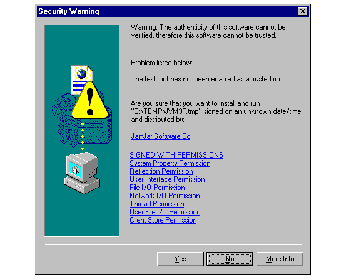 We could place this applet in a signed CAB in the same way as the last example. However, when that applet loaded it told the user that we wanted a lot of permissions that, in fact, we did not (see See Warning from Internet Explorer ). This is because we specified a security level of "medium" in the signcode command. It would be friendlier if we could just ask for the things we really need.