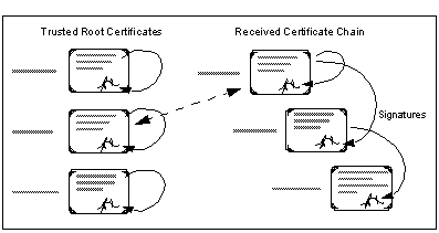 A public key certificate can also embody a chain of trust. Consider the situation shown in See Certificate Hierarchy . A system has received a request containing a chain of certificates, each of which is signed by the next higher CA in the chain. The system also has a collection of root certificates from CAs that it views as trusted. It can match the top of the chain in the request with one of these root certificates ("Ham"). If the chain of signatures is intact, the receiver can infer that Nimrod is trustworthy and that it inherits its trustworthiness from Ham.