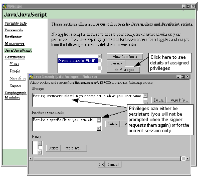 You can also review the permissions that you have given a particular signer, as shown in See Displaying Privileges Given to a Signer . Note that under this scheme there is no way to predefine permissions in this dialog; they only appear when a signed applet (or JavaScript script) requests privileges.