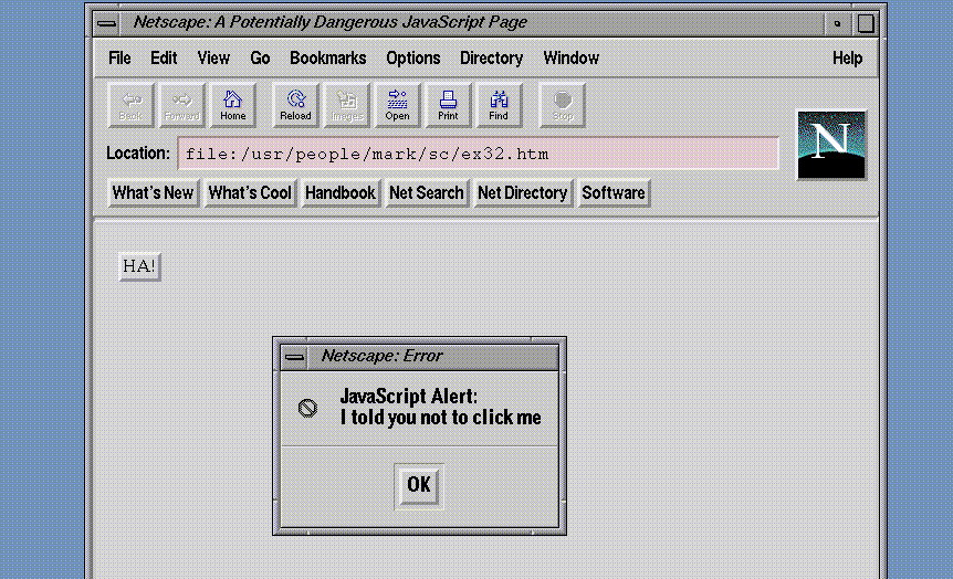If you copy this code, change the e-mail address in the form's ACTION to your own e-mail address, and then read that file into your browser, everything will be fine. Notice that the click event handler for the button is declared using the HTML attribute onClick="dontclickme()", which tells JavaScript that when this button is pressed the function dontclickme should be called. (The exact syntax for declaring event handlers is discussed in the next section.) If you now click that button you should see something like figure 3.5.