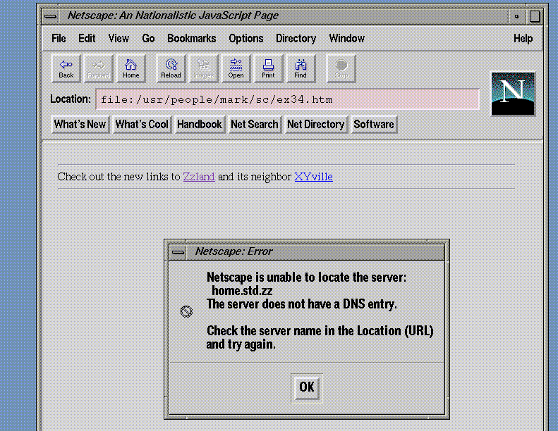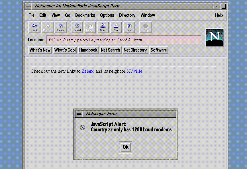Statement 2 extracts the hostname part of that object, which in this example could be either home.std.zz or home.xyzzy.xy, depending on where the mouse is located. The next three statements use some of the string object functions (see "String Content Methods," in chapter 4) to tear off the last part of this fully qualified hostname, namely zz or xy, and save it in the variable domain. This variable is then tested against zz in statement 7. If the test passes then an alert is put up to warn the user that the connection to the zz home page will take longer due to slow modems. Links can also have click event handlers, so this code can be modified not only to warn the user, but also to abort the connection, if necessary. The result of placing the mouse over the Zzland link is shown in figure 3.6.