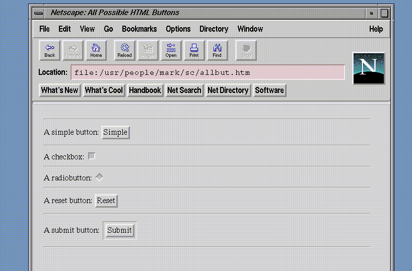Simple buttons are defined using the HTML <INPUT TYPE="button">. Checkboxes define options, which are either off (not checked) or on (checked). These are created using an <INPUT TYPE="checkbox"> directive. Radio buttons use the <INPUT TYPE="radio"> directive, and permit the user to select exactly one of a set of choices. Submit buttons and reset buttons are very special. Submit buttons, created by <INPUT TYPE="submit">, are used to end input operations on a form. When the submit button is pressed the contents of the form are packaged and sent to the URL target specified in the ACTION attribute of the <FORM> definition. Reset buttons bring the form back to its initial state, wiping out any input the user has performed; they are specified as <INPUT TYPE="reset">. Figure 3.2 shows a simple HTML form with all five button types; it was generated by the HTML file allbut.htm.