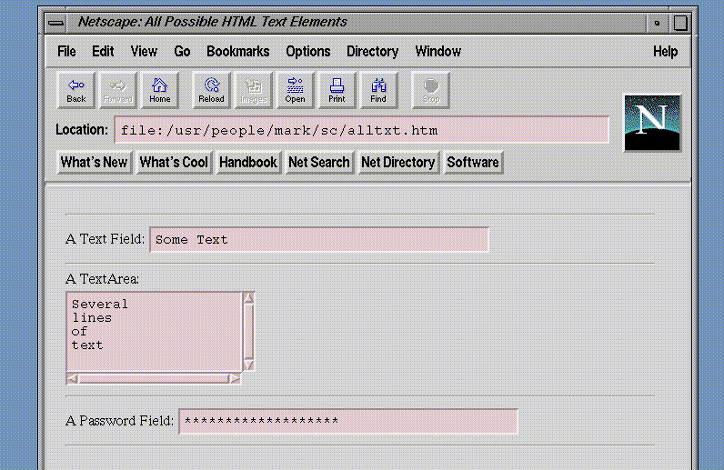 Single line text fields are created with an <INPUT TYPE="text"> directive. Any text you type in a text field is displayed as you type it. This behavior is known as echoing the input. Single line text fields that are created using <INPUT TYPE="password"> do not echo their input. Multi-line text fields are created with the TEXTAREA tag, and are usually called textareas. An HTML form showing all three types of text elements is shown in figure 3.3, created from the file alltxt.htm. Interacting with text is more complex than interacting with a button. There are more things you can do with text. You can click in the text field, enter text, edit text, select text, and decide you are finished with the text and move on.