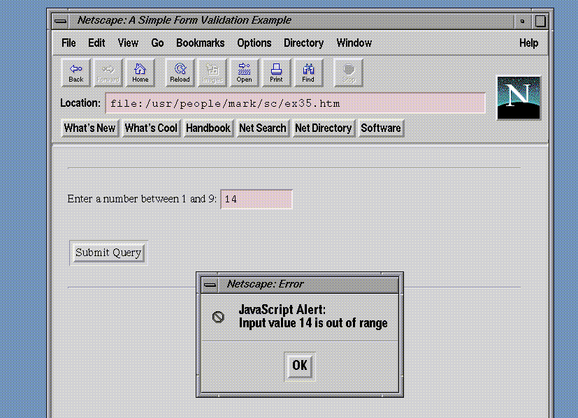 If the text field was out of range then the else pathway in statement 6 is taken. Note that parseInt returns 0 if its argument cannot be parsed as an integer. This means that if the user entered "five" in the text field rather than "5" the value of intval will be 0, and the else clause will be taken. Statement 7 puts up an alert dialog box telling the user that the value was out of range. It contains the string representation of the value. This is useful since the alert dialog box may be inadvertently positioned over the text input field. Finally, statement 8 returns false, indicating that the submit operation should not complete. The outcome of entering a value that is out of bounds is shown in figure 3.7.