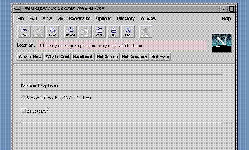 JavaScript event handlers are ideal for this kind of validation. As you learn in chapter 4, every HTML form element is also a JavaScript object. You have already seen some examples of this in listings 3.4 and 3.5. Listing 3.6 shows two radio buttons working together with a checkbox using a JavaScript onClick event handler. The initial appearance of this form is shown in figure 3.8.