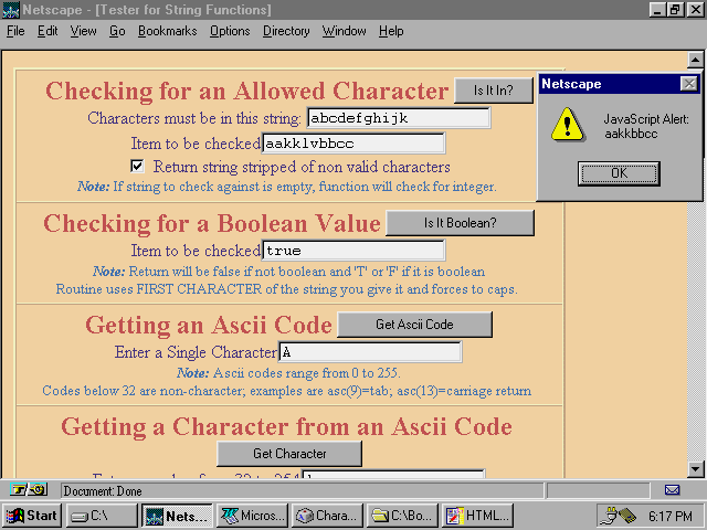 The first portion of the isIn() function makes sure that astr and nstr are both strings, and initializes nstr to its default value if it was given as the empty string. It also insures that strip is boolean (the function isBoolean() is described under "Boolean Validation," below). The for loop then examines every character in astr. The substring function extracts each character into the local variable cc and checks to see if that character may be found in nstr using a second for loop. If any unacceptable characters are found the isit variable is set to true. This for loop is also responsible for building a new string, in the local variable bstr, which contains only acceptable characters.
