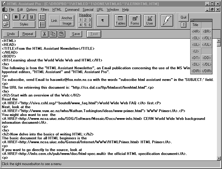 HTML Assistant comes in two versions: a freeware version with enough basic features for many HTML files, and a commercial version (HTML Assistant Pro 2, available for $99.95) that includes many more features (more HTML tags, a nice spell checker, a tool for automatic page creation, and other options), support, and a manual.