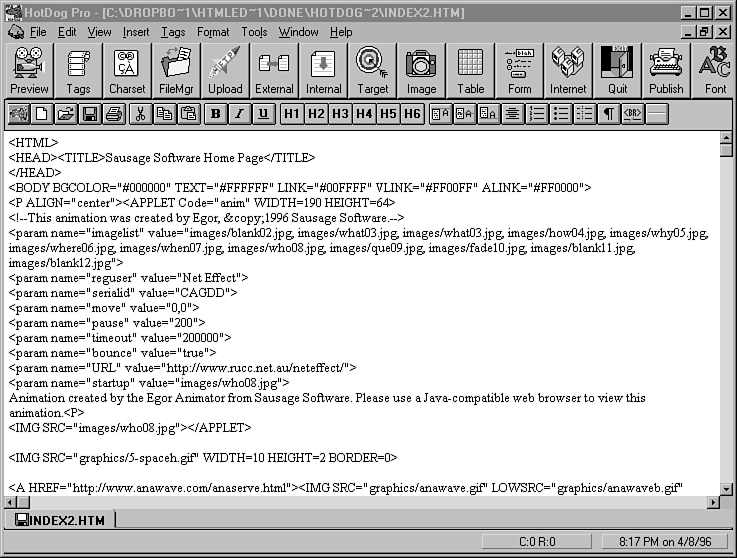 A: For the vast majority of my HTML work, I use a plain old text editor: Emacs on a UNIX system, or Alpha on a Macintosh. However, many of the editors I've reviewed in this chapter have impressed me, HotDog and Netscape Gold in particular, so I may start using an editor for some of the more basic pages. I don't think anything will entirely replace working directly with the tags, however; it's difficult for an editor to be able to keep up with the rapid changes in HTML technology and still be easy to use.