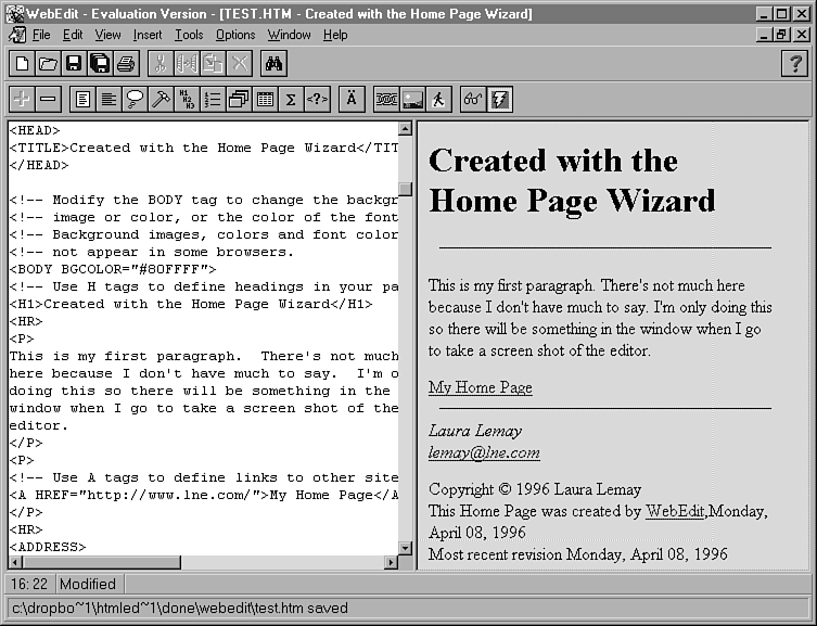 WebEdit allows you to preview your work either in the browser of your choice or in a built-in previewer. The previewer is particularly interesting, as it allows you to edit the page on one side of the screen and view the immediate result on the other side. The previewer supports a subset of the tags available in the editor itself: all of HTML 2.0, and selected extensions.