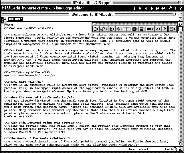 The documentation for HTML Editor is available at http://dragon.acadiau.ca/~giles/HTML_Editor/Documentation.html. You can get the actual package from ftp://cs.dal.ca/giles/HTML_Editor_1.1.4.sit.hqx.