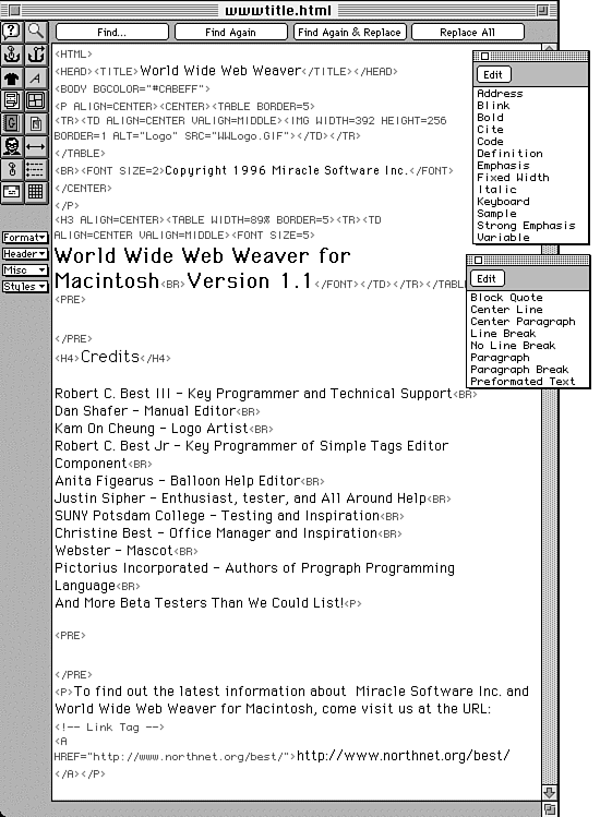 HTML Editor is a freeware editor (see Figure 6.14) that lets you insert tags into your file and see the result in a WYSIWYG fashionat the same time. The tags are shown in a lighter color than the surrounding text, and the text looks like it would look in Netscape or Mosaic, although you can change the appearance of any style and apply it throughout the document. There are options to hide the tags in your document to get the full effect, and you can also preview the document using your favorite browser.