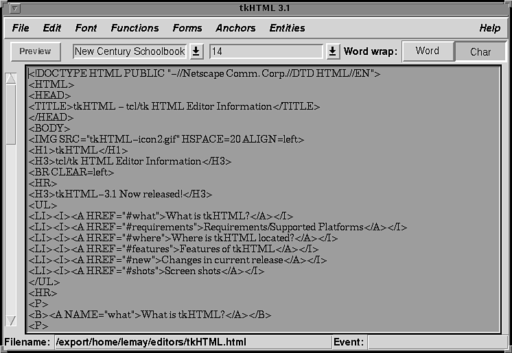 tkHTML, by Liem Bahneman, is a simple freeware graphical HTML tag editor for the X11 Window System that uses the TCL language and the tk toolkit (you don't need to have either installed). Menu items allow you to insert tags into your text, either by inserting the tag and then typing, or by selecting text and choosing the tag that text should have. tkEdit easily allows you to convert existing text to HTML, and a Preview button automatically previews your HTML files using Netscape, Mosaic, or Lynx (Netscape is the default). Figure 6.6 shows tkHTML.