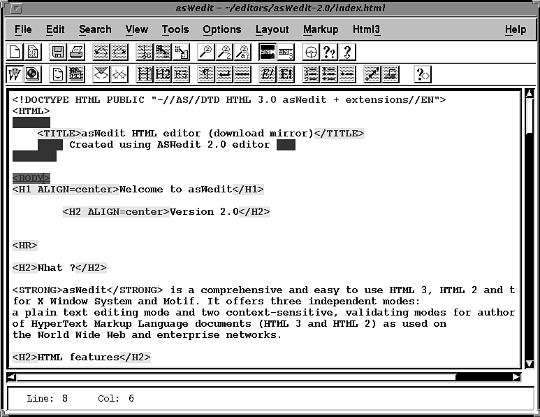 AsWedit (short for AdvaSoft's Web Editor, presumably, and shown in Figure 6.7), also for the X Window System running Motif and available for many different UNIX flavors, is a context-sensitive HTML editor. Context sensitive means that different tags and options are available depending on where you've put the cursor in the HTML code. So if the cursor is inside a list, the only choice you have is to include a list item, for example.