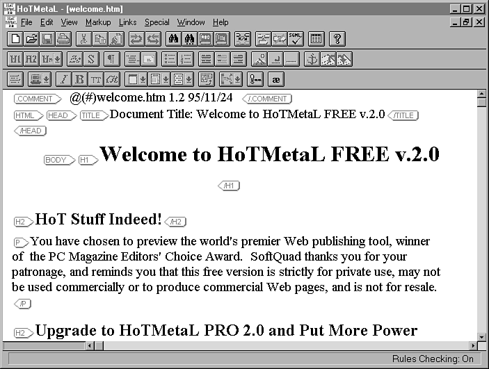 HoTMetaL comes in two versions, a freeware version and a "professional" commercial version. The freeware version (called, appropriately, HoTMetaL Free) has all the basic capabilities and support for HTML 2.0, HTML 3.0, and all the Netscape extensions. The commercial version, HoTMetaL Pro 2.0, for $195, has additional features for importing and converting files from word processors, a spell checker, free updates when new tags appear, a thesaurus, keyboard macros, and full support.