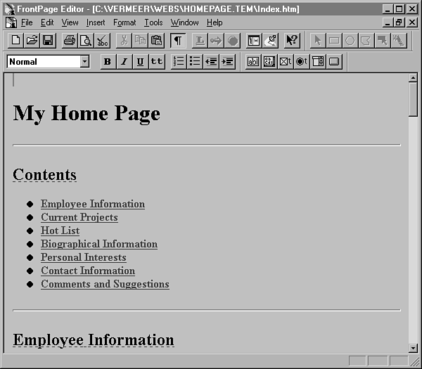 Microsoft's Front Page, formerly by a company called Vermeer, is an integrated Web site construction and maintenance kit that includes a Web site administration tool, a Web server, and various other tools for administering the entire package. The Web page editor itself (Front Page Editor, as shown in Figure 6.12) is only a small part of the overall package.