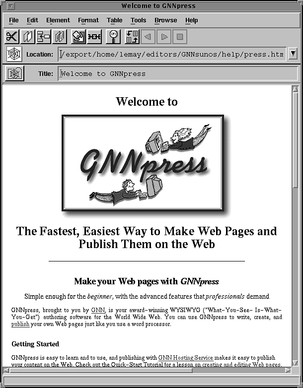 GNNpress is right up there with Netscape Gold in terms of ease of use, although the main HTML elements and features are all in menu items as opposed to on the tool bar (the tool bar itself had overly small and difficult-to-understand icons).