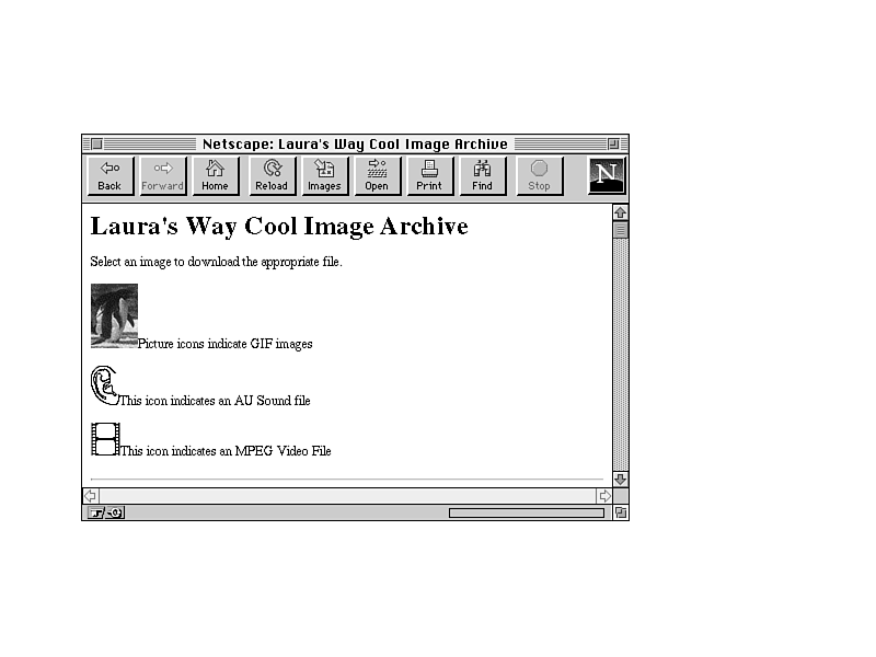 <HTML> <HEAD> <TITLE>Laura's Way Cool Image Archive</TITLE> </HEAD> <BODY> <H1>Laura's Way Cool Image Archive</H1> <P>Select an image to download the appropriate file.</P> <P><IMG SRC="penguinslittle.gif">Picture icons indicate GIF images</P> <P><IMG SRC="earicon.gif">This icon indicates an AU Sound file</P> <P><IMG SRC="film.gif">This icon indicates an MPEG Video File</P> <HR> <H2>Images</H2> <H2>Sound Files</H2> <H2>Video Files</H2> </BODY> </HTML>