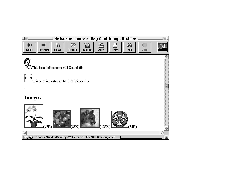Note that I included values for the ALT attribute to the <IMG> tag, which will be substituted for the images in browsers that cannot view those images. Even though you may not intend for your Web page to be seen by nongraphical browsers, it's polite to at least offer a clue to people who stumble onto it. This way, everyone can access the media files you are offering on this page.