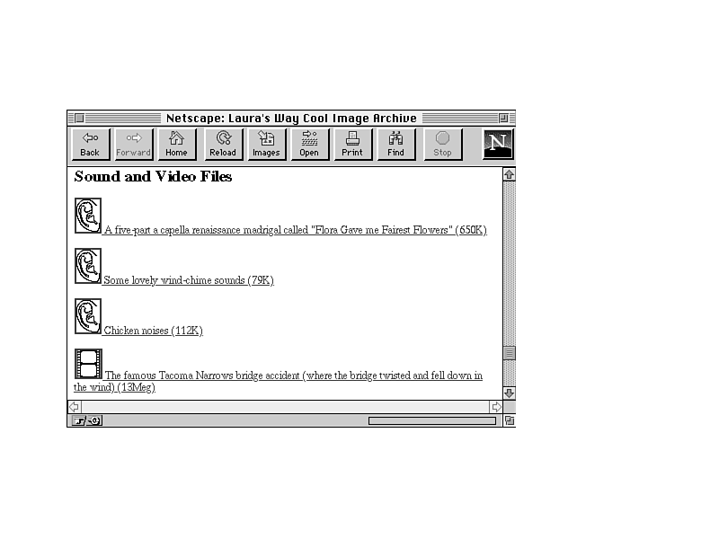 Keep in mind that this sort of archive, in its heavy use of inline graphics and large media files, is optimally useful in graphical browsers attached to fast networks. However, the Web does provide advantages in this respect over FTP or Gopher servers, even for text-only browsers, simply because there is more room available to describe the files on the archive. Rather than having only the filename to describe the file, you can use as many words as you need. For example:
