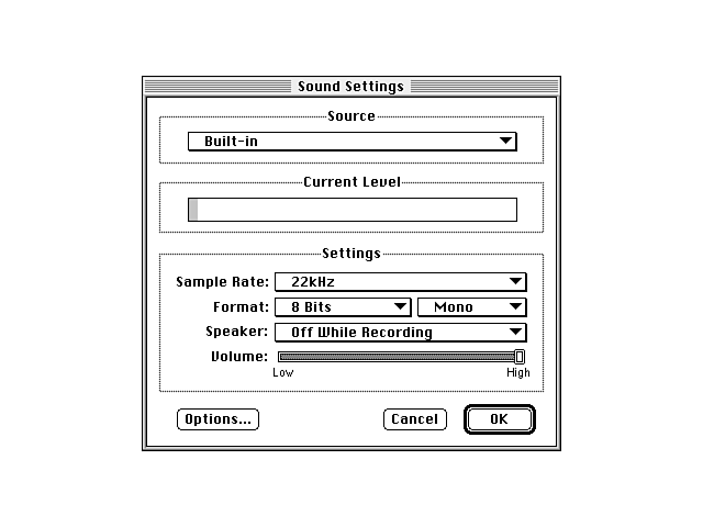 Macintoshes have had sound capabilities built in for many years now, and most Macs are shipped with either a built-in microphone or a separate plug-in microphone. You can record directly into the microphone (for mono 22KHz, 8-bit sounds) or plug a standard stereo audio jack into the back of the computer. Most newer Macs are capable of recording 16-bit stereo at up to 48KHz (44KHz is CD quality, 48KHz is DAT (Digital Audio Tap) quality); check with the specifications for your model to see what it's capable of.