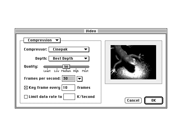 Indeo was initially available only for VfW files, but QuickTime 2.0 now supports it as well, making it a close second for the most popular codec for digital video, and it's catching up fast.
