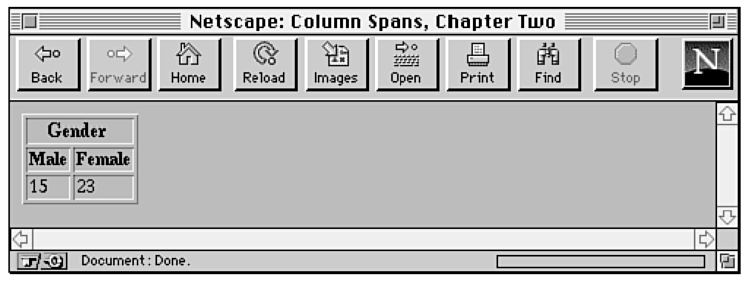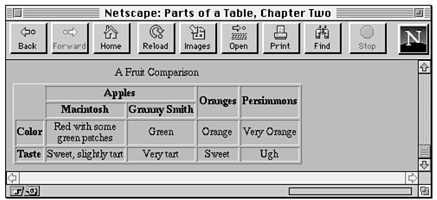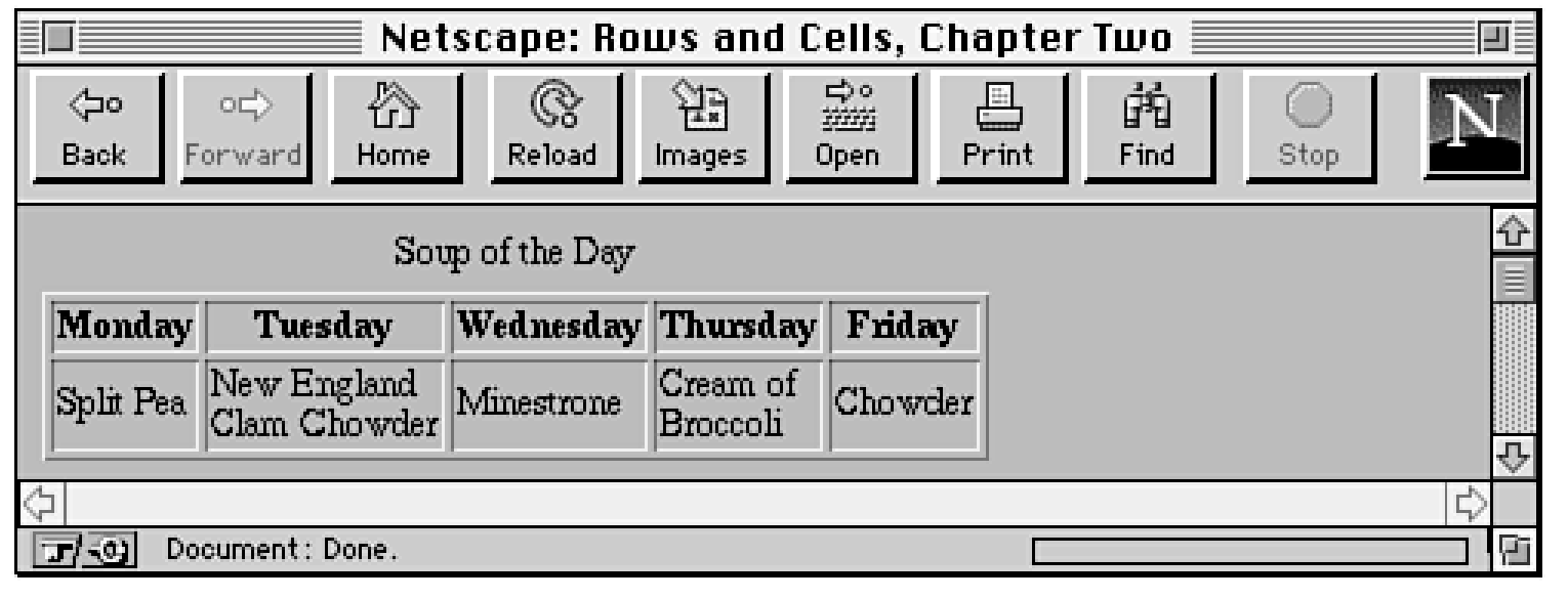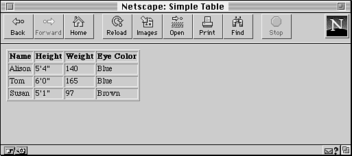 The following input and output example shows a simple table. Figure 13.3 shows its result in Netscape.