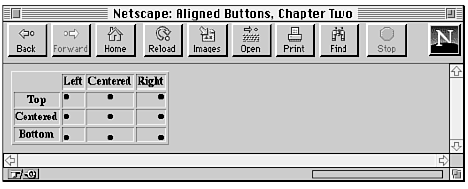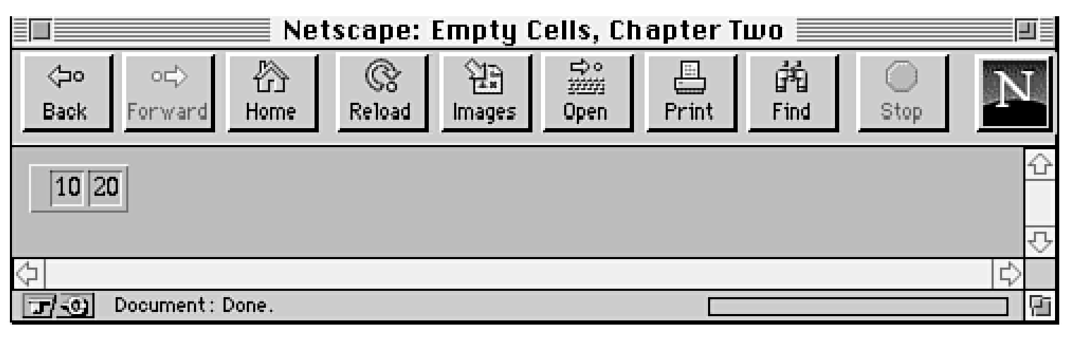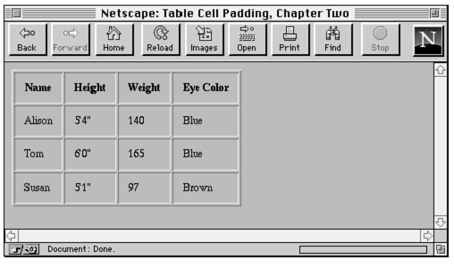 Cell padding is the amount ofspace between the edges of the cells and the cell's contents. By default, Netscape draws its tables with a cell padding of 1 pixel. You can add more space by adding the CELLPADDING attribute to the <TABLE> tag, with a value in pixels for the amount of cell padding you want. Figure 13.31 shows an example of a table with cell padding of 10 pixels.