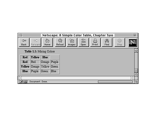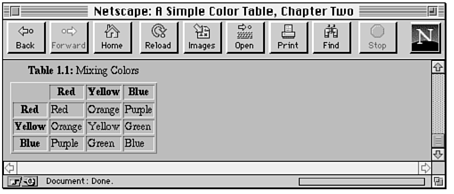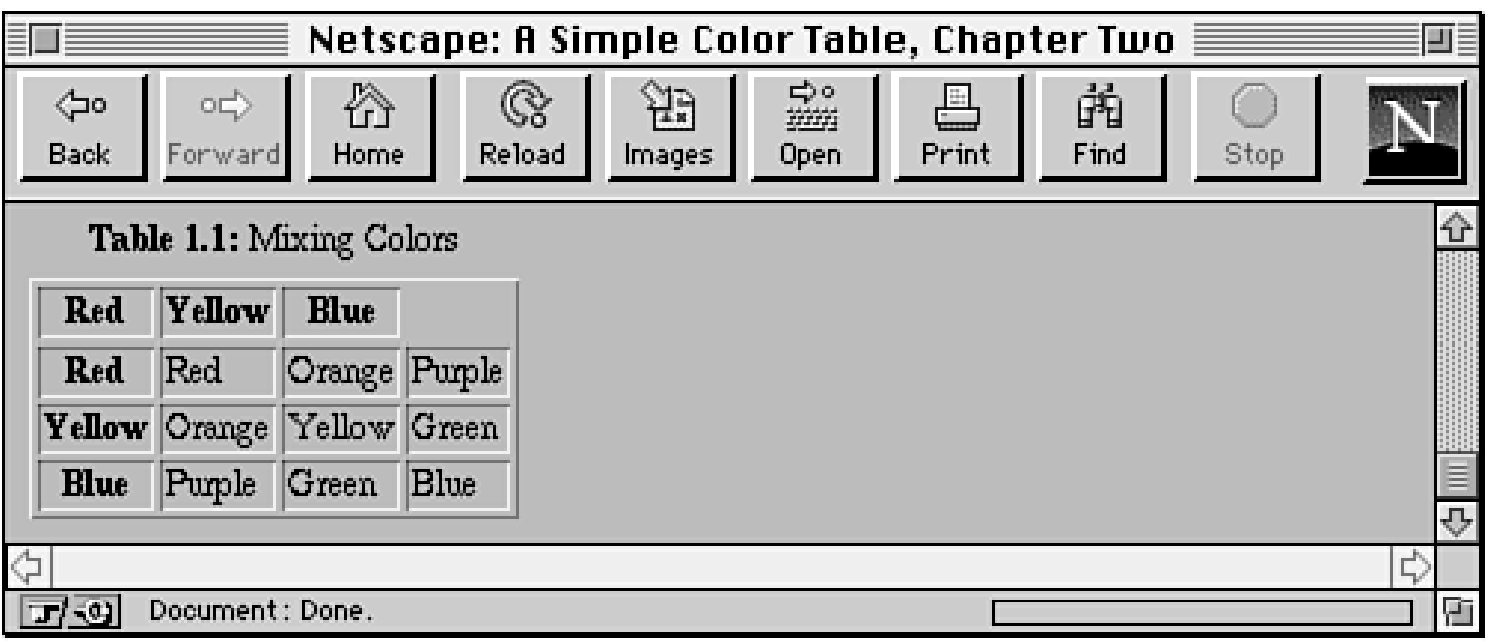 <TABLE BORDER> <CAPTION><B>Table 1.1:</B> Mixing Colors</CAPTION> <TR>