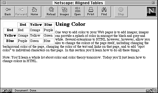 Just when tables were becoming consistent amongst browsers, someone had to come along and add a whole bunch of new features. That someone was Microsoft, with their Internet Explorer browser, which supports several attributes that allow you to change the color of various parts of the table. Netscape has since included support for background colors in the newest version of its browser, but for the most part these attributes are very new and not commonly supported by most browsers on the Web, and so keep this in mind if you choose to use these tags.
