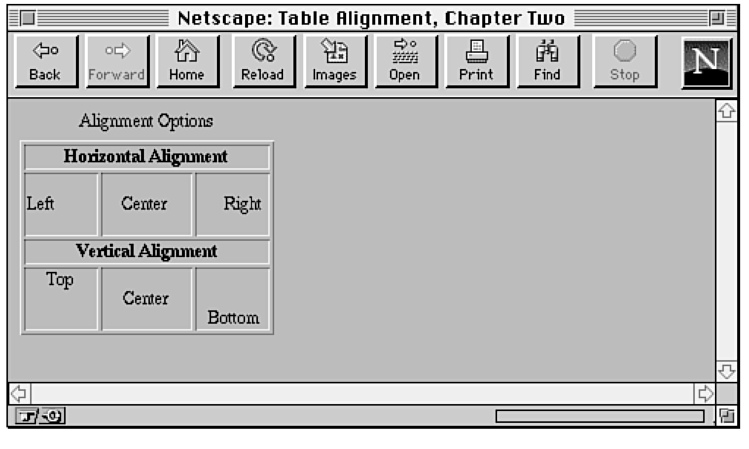 In Internet Explorer, however, captions are different. Using Internet Explorer, you use the VALIGN attribute to put the caption at the top or the bottom, and ALIGN has three different values: LEFT, RIGHT, and CENTER, which align the caption horizontally.