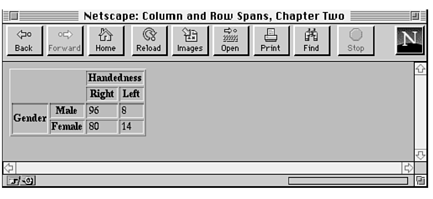 One more note, however. Creating tables by hand in HTML is no fun. The code for tables was designed to be easy to generate by programs, not to be written by hand, and as such it's rather confusing. You'll do a lot of experimenting, testing, and going back and forth between your browser and your code to get a table to work out right. HTML editors can help a great deal with this, as can working initially in a word processor's table editor or a spreadsheet to get an idea of what goes where. But I suggest doing at least your first bunch of tables the hard way so you can get an idea how HTML tables work.