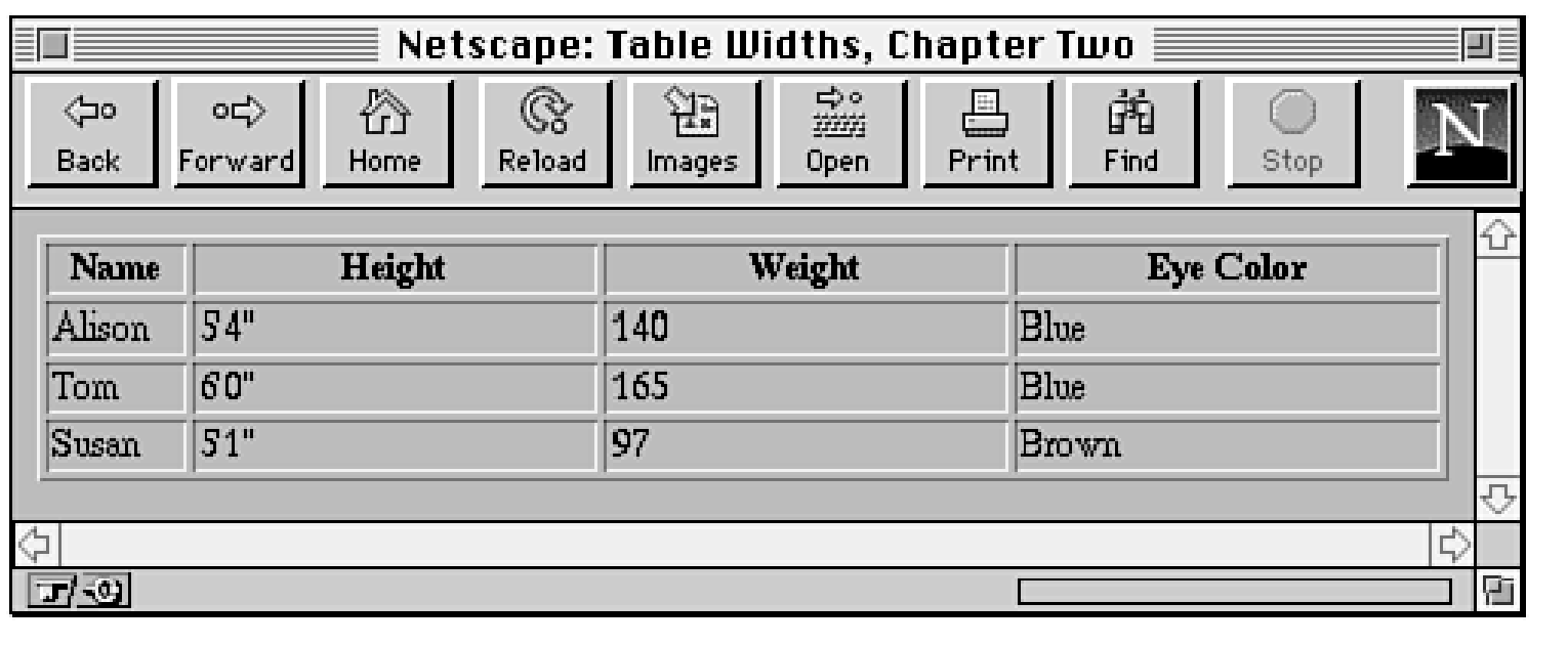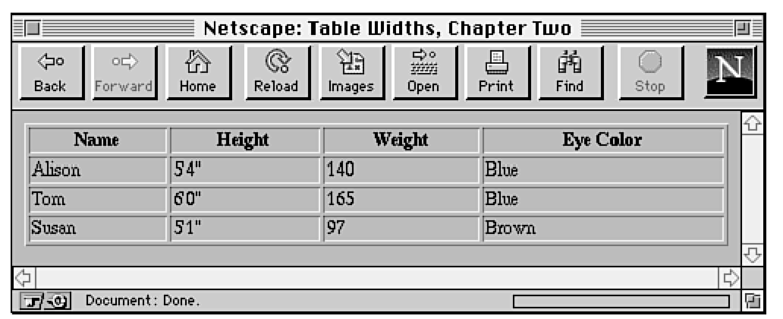 The WIDTH attribute can also be used on individual cells (<TH> or <TD>) to indicate the width of individual columns. As with table width, the WIDTH tag in calls can be an exact pixel width or a percentage (which is taken as a percentage of the full table width). As with table widths, using percentages rather than specific pixel widths is a better idea because it allows your table to be displayed regardless of the window size.