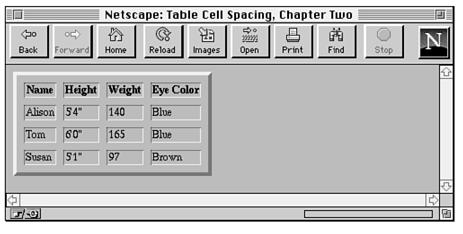 Cell spacing also includes the outline around the table, which is just inside the table's border (as set by the BORDER attribute). Experiment with it, and you can see the difference. For example, Figure 13.30 shows an example of a table with cell spacing of 8 and a border of 4.