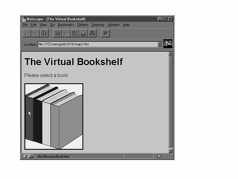 With regions and a list of coordinates, you just need the Web pages to jump to when the appropriate book is selected. These can be any documents, or they can be scripts; you can use anything you can call from a browser as a jump destination. For this example, I've created a document called redbook.html and stored it inside the www directory on my Web server. (You can also find this file on the CD accompanying this book.) This is the page we'll define as the end-point of the jump when the red book is selected.
