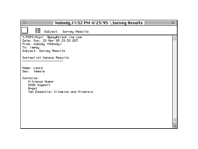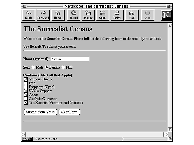 <HTML><HEAD> <TITLE>The Surrealist Census</TITLE> </HEAD><BODY> <H1>The Surrealist Census</H1> <P>Welcome to the Surrealist Census. Please full out the following form to the best of your abilities.</P> <P>Use <STRONG>Submit</STRONG> To submit your results. <HR> <FORM METHOD="POST" ACTION="/cgi-bin/uncgi/mailcensus"> <P><STRONG>Name: </STRONG><INPUT TYPE="TEXT" NAME="theName"></P> <P><STRONG>Sex: </STRONG> <INPUT TYPE="radio" NAME="theSex" VALUE="male">Male <INPUT TYPE="radio" NAME="theSex" VALUE="female">Female <INPUT TYPE="radio" NAME="theSex" VALUE="null">Null </P> <P><STRONG>Contains (Select all that Apply): </STRONG><BR> <INPUT TYPE="checkbox" NAME="humor">Vitreous Humor<BR> <INPUT TYPE="checkbox" NAME="fish">Fish<BR> <INPUT TYPE="checkbox" NAME="glycol">Propylene Glycol<BR> <INPUT TYPE="checkbox" NAME="svga">SVGA Support<BR> <INPUT TYPE="checkbox" NAME="angst">Angst<BR> <INPUT TYPE="checkbox" NAME="catcon">Catalytic Converter<BR> <INPUT TYPE="checkbox" NAME="vitamin">Ten Essential Vitamins and Nutrients<BR> </P> <P><INPUT TYPE="SUBMIT" VALUE="Submit Your Votes"> <INPUT TYPE="RESET" VALUE="Clear Form"></P> <FORM> <HR> </BODY></HTML>