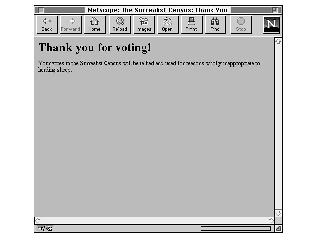 echo Content-type: text/html echo echo "<HTML><HEAD>" echo "<TITLE>The Surrealist Census: Thank You</TITLE>" echo "</HEAD><BODY>" echo "<H1>Thank you for voting!</H1>" echo "<P>Your votes in the Surrealist Census will be tallied and" echo "used for reasons wholly inappropriate to herding sheep.</P>" echo "</BODY></HTML>"