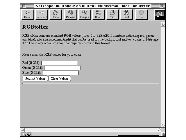 <HTML><HEAD> <TITLE>RGBtoHex: an RGB to Hexadecimal Color Converter</TITLE> </HEAD><BODY> <H2>RGBtoHex</H3> <P>RGBtoHex converts standard RGB values (three 0 to 255 ASCII numbers indicating red, green, and blue), into a hexadecimal triplet that can be used for the background and text colors in Netscape 1.1 or in any other program that requires colors in this format. <HR> <FORM METHOD=POST ACTION="/cgi-bin/rgb.cgi"> <P>Please enter the RGB values for your color: <P>Red (0-255): <INPUT TYPE="text" NAME="red"><BR> Green (0-255): <INPUT TYPE="text" NAME="green"><BR> Blue (0-255): <INPUT TYPE="text" NAME="blue"><BR> <INPUT TYPE="submit" VALUE="Submit Values"><INPUT TYPE="reset" VALUE="Clear Values"> <HR> </BODY></HTML>