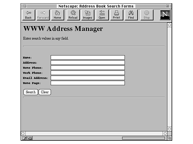 The form for searching the address book is quite ordinaryjust a simple set of text fields. Nothing new or exciting here. I did use preformatted text in this example so the fields would all line up:
