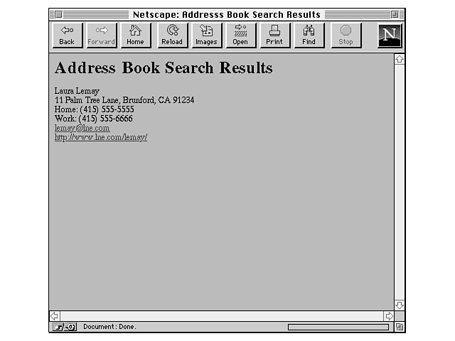 When the form is submitted, the CGI script searches the address file and returns all the records that it finds, including automatically generating links for the e-mail and home page fields, as shown in Figure 20.7.