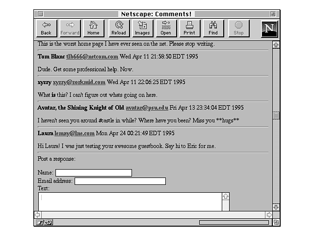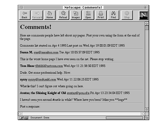 Why stop with a guest book? The framework that I've described for the guest book could be extended into a Web-based conference system or a discussion board such as those provided by Usenet news.