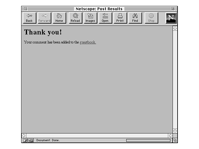 Actually, this guest book script was written as part of a larger HTML conference system called htmlbbs, which you'll see in action in Chapter 28. With the framework for adding individual posts in place, adding a larger framework for multiple topics isn't that difficult.
