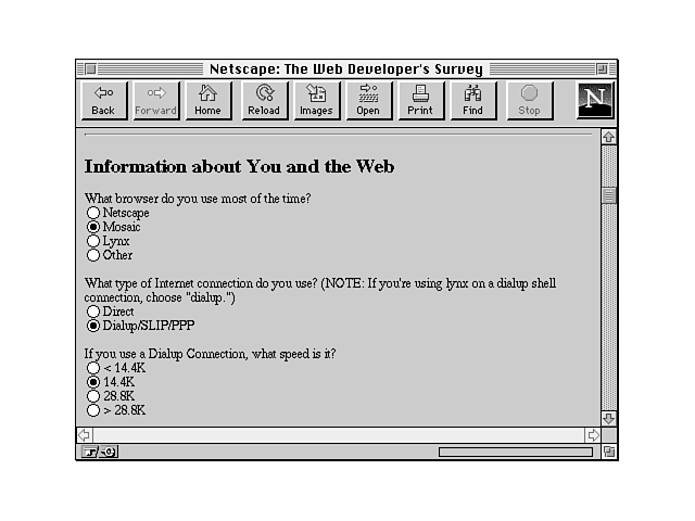 The first part (shown in Figure 22.2) contains three sections: the type of browser you use (with the top threeNetscape, Mosaic, and Lynxhaving individual buttons, and everything else coming under Other); the type of connection you use to connect to the Net (direct or dialup); and, if you use a dialup connection, at what speed you use it. We don't really care about what speed your connection is if you're on a direct connectionfast is fast.