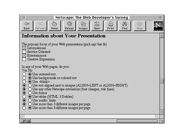 This page explains the survey, who's doing it, why, and how the results will be used. It's a general overview of the survey itself. From here you have two choices: you can take the survey itself, or you can see the results either in HTML 3.2 or text-only tables.