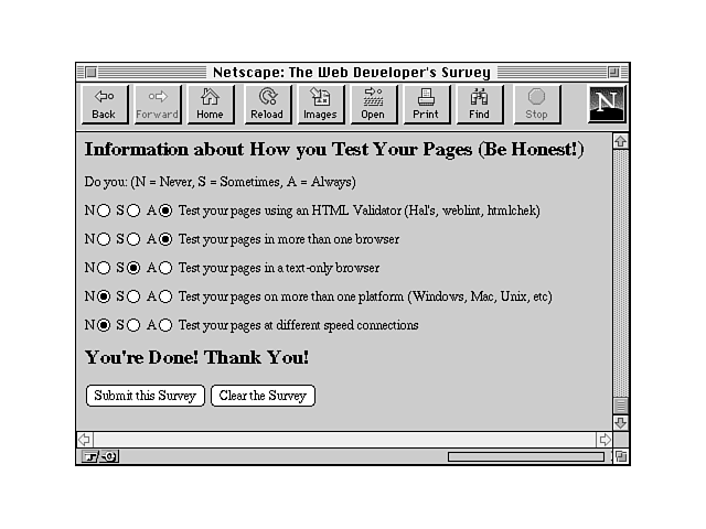 A: I agree. I'm not a very good statistician. My intent was not to create a really good form, but rather to show an example of how data can be collected, sorted, and processed using forms and CGI scripts.
