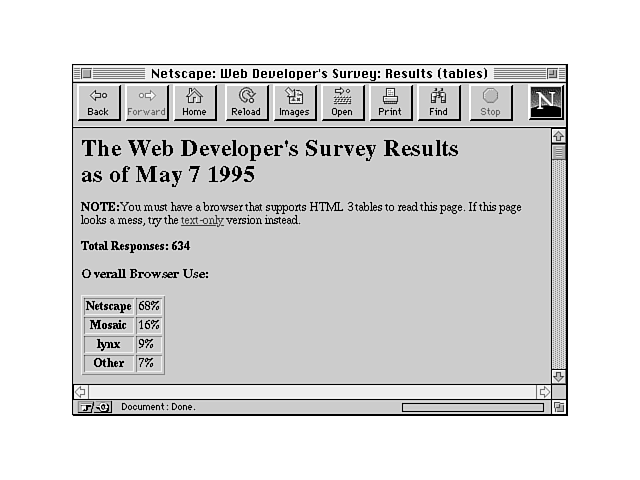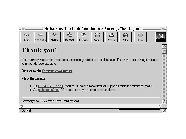 You have two choices of how you can view the results: in HTML 3.2 table form or as text-only tables. As in the Beanpole software presentation in the previous chapter, it's a good idea to provide multiple renditions of the same table for browsers that don't support tables. Survey results, however, are a great use for tables, so we don't want to avoid them altogether. It's extra work to create both of these pages, but the result is compatible with most browsers and looks nice in the browsers that can support it.