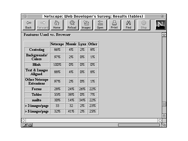 The presentation we'll go through in this section is a Web developer's surveya survey on what sort of things HTML authors are doing with their pages and how they are testing them, all correlated against the browser and the connection they're using. (Will Netscape users be more prone to including Netscape extensions in their documents? Well, probably, but how much? Now you can find out.)
