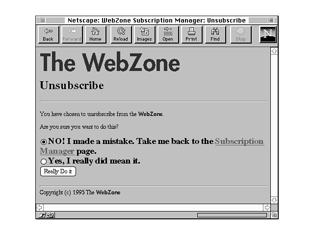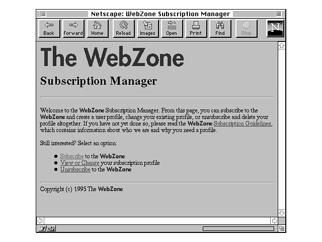 You've read the WebZone for awhile, and it really doesn't appeal to you. You would like to unsubscribe. So back to the subscription manager page you go, and you choose the Unsubscribe link.