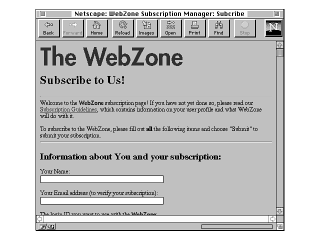 The first step is subscribing to WebZone. When you select the Subscribe link, the form shown in Figure 22.11 appears.