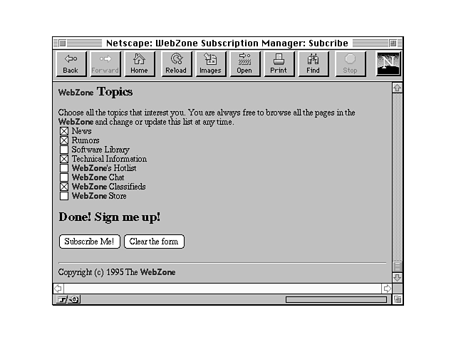 The final portion of the form deals with the sections of WebZone magazine itself that you're interested in. There are eight of them; you can choose those that look interesting (see Figure 22.14).